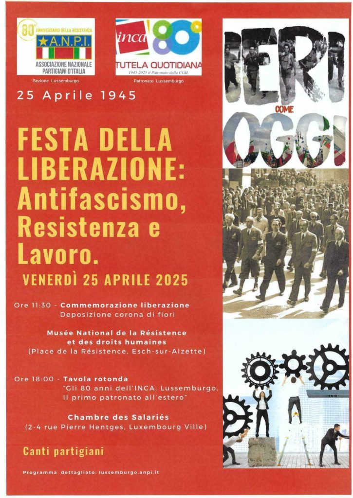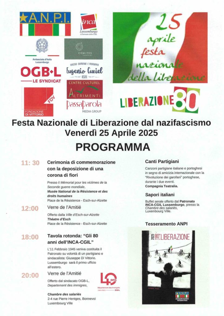 Se tiveres tempo, disponibilidade e vontade, podes juntar-te a nós, na Place de la Résistance, em Esch-sur-Alzette no dia 25 de Abril às 11h30, para celebrar os 80 anos da libertação do fascismo em Itália, os 51 anos do 25 de Abril em Portugal e cantar, em conjunto, “Grândola, Vila Morena”.